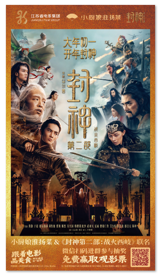 随光影流转,享美好“食”光。活动期间“电影+美食”融合创新,南京市40多家“小厨娘淮扬菜”门店同步推出“封神第二部:战火西岐”联名套餐,套餐内包括多道淮扬美食,打开“大众点评APP"即可购买“封神联名套餐”。小厨娘淮扬菜南京江北虹悦城店和环宇城店还限时落地“封神”主题餐厅。