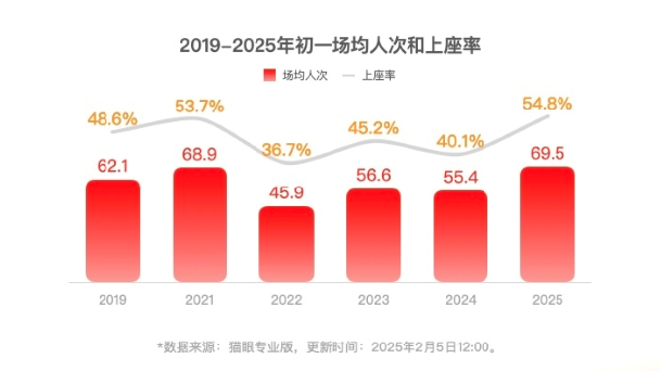 可以看出,2025年春节档为今年电影市场打响了当头炮。档期的票房表现不仅彰显了头部影片对电影市场的巨大拉动作用,更充分展现了中国电影市场广阔的上升空间与强劲的发展潜力。
