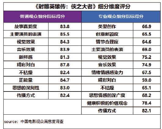 作为近年来电影市场较为稀缺的武侠题材影片,《射雕英雄传:侠之大者》以徐克美学重塑金庸经典,获得观众满意度82.9分,较徐克导演的上一部古装动作片《狄仁杰之四大天王》高1.3分。