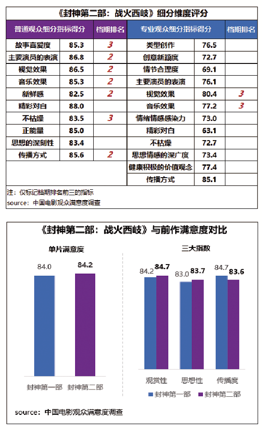 从细分维度来看,在普通观众评价中,《封神第二部:战火西岐》主要演员的表演、视觉效果、音乐效果、新鲜感和传播方式得分居档期第二位,故事喜爱度、不枯燥指标得分居第三位;在专业观众评价中,影片的视觉效果、音乐效果得分居档期第三位。