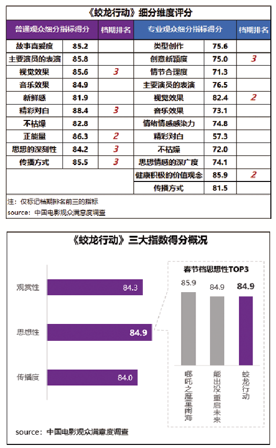 《蛟龙行动》为林超贤导演又一部军事题材力作,影片延续了《红海行动》紧张激烈的战斗场景,展现出的中国军事力量与自信让观众感受到勇气和热血。影片观众满意度得分84.4分,三大指数中思想性得分最高,为84.9分,与《熊出没·重启未来》并列档期第二位。