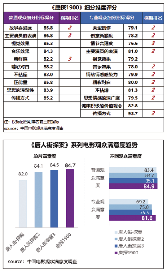 从细分维度来看,在普通观众评价中,《唐探1900》的故事喜爱度居档期第二位,主要演员的表演、新鲜感得分居第三;专业观众方面,影片在12项指标中有10项居档期第二位,其中主要演员的表演、精彩对白、不枯燥、类型创作等指标得分较高,都超过了79分,传播方式得分93.7分。