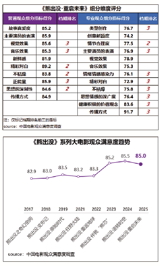 “熊出没”系列自2017年以来连续八年深耕春节档,创作水平稳扎稳打,《熊出没·重启未来》观众满意度虽然较前两部略有下滑,但仍在85.0分的相对高位,居档期第二位,是系列第三部突破85分的影片。影片三大指数都超84.5分,其中思想性得分84.9分、传播度得分86.2分,都居档期第二位。