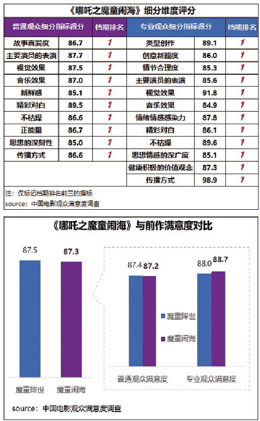 《哪吒之魔童闹海》观赏性87.1分、思想性85.9分、传播度90.0分,都为2025年春节档第一名。影片普通观众满意度87.2分、专业观众满意度88.7分,分别居历史调查动画影片的第二、第一位,同时其专业观众满意度仅次于《我不是药神》的89.5分居历史调查所有影片的第二高位,为专业观众评价最“满意”的动画影片。