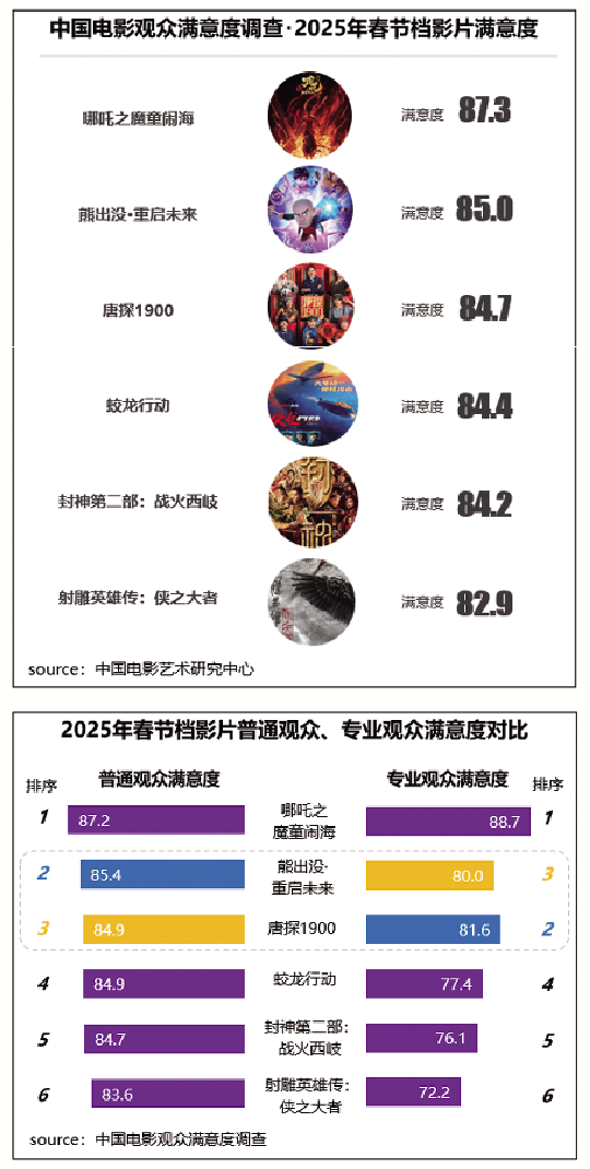 中国电影观众满意度调查·2025年春节档调查结果显示,春节档主调查的六部影片都突破82分,其中《哪吒之魔童闹海》满意度87.3分,超越去年档期第一的《飞驰人生2》(86.2分),为近两年春节档观众最“满意”影片。《熊出没·重启未来》85.0分居第二位,《唐探1900》《蛟龙行动》《封神第二部:战火西岐》三部影片都超84分,《射雕英雄传:侠之大者》超82分。