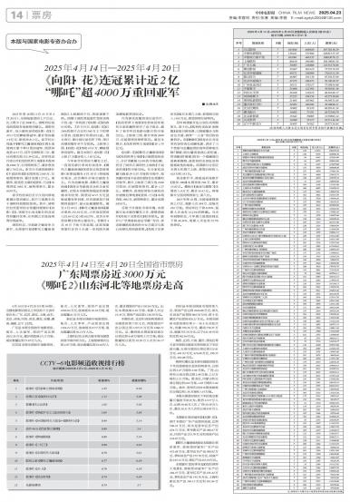 4月14日至4月20日(第16周),全国电影票房排名上半区的十五省市依次为:广东、江苏、浙江、上海、...