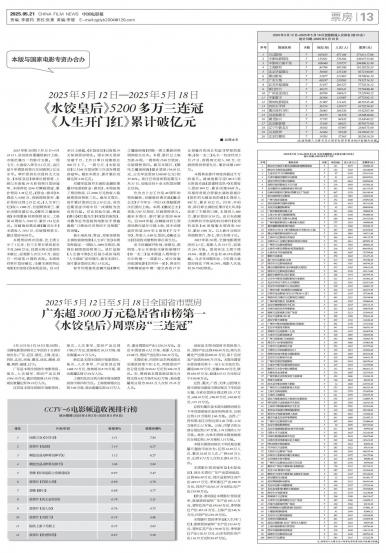 5月12日至5月18日(第20周),全国电影票房排名上半区的十五省市依次为:广东、江苏、浙江、上海、...