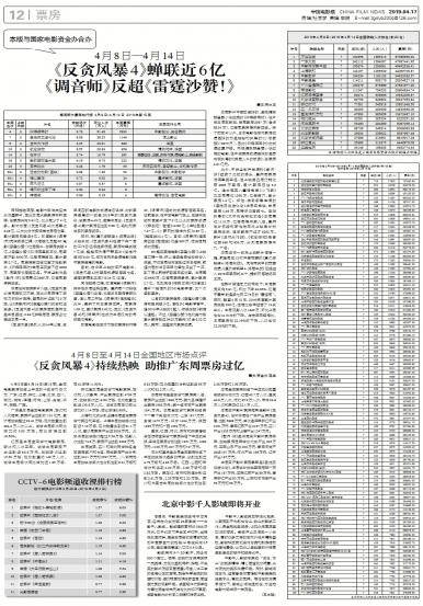 - 2019年4月8日-2019年4月14日全国影院人次排名(前100名)