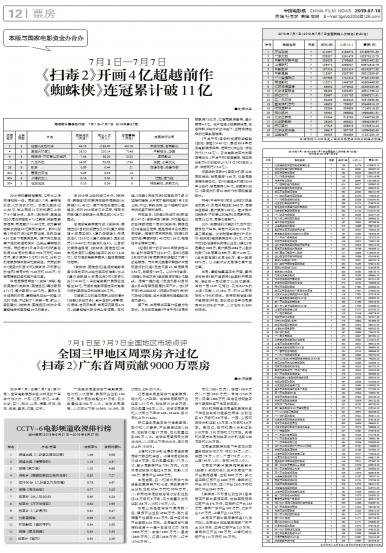 - 全国三甲地区周票房齐过亿 《扫毒2》广东首周贡献9000万票房