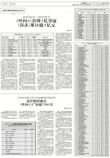 12月16日至12月22日(第51周),全国电影票房排名上半区的十五省市依次为:广东、江苏、浙江、上...