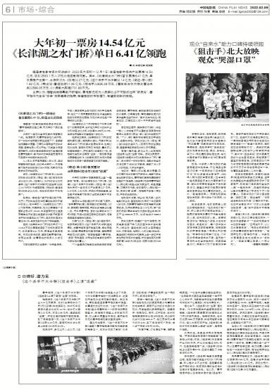 据国家电影专资办初步统计:2022年大年初一(2月1日)全国电影市场共产出票房14.54亿元,吸引2...