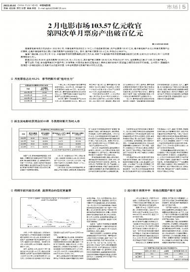 据国家电影专资办初步统计:2022年2月,中国电影市场共吸引2.15亿人次走进影院观影,共产出票房1...