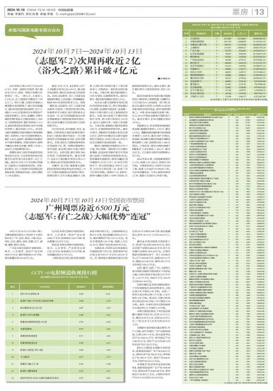 10月7日至10月13日(第41周),全国电影票房排名上半区的十五省市依次为:广东、江苏、浙江、上海...