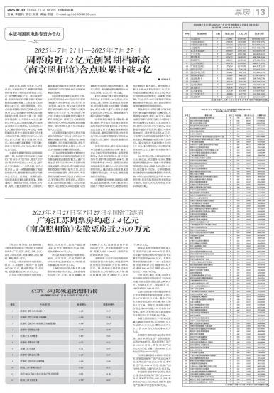 2025年第30周(7月21日-7月27日),在新片带动下,暑期档单周票房持续攀升,全国票房报收近1...